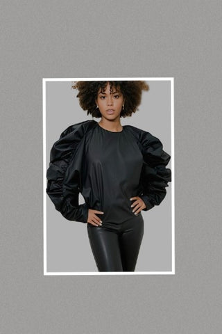 Leather Ruched Puff Sleeve Top (Black) Extended Sizes