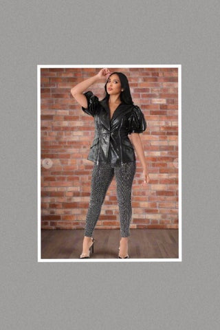 Chic Faux Leather Puff Sleeve Statement Jacket (Black) Extended Sizes