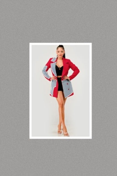 This Red and Denim Mix Casual Blazer is a fashion-forward choice that combines multi-fabric elegance, blazer coat sophistication, and convenient pockets. It's a versatile addition to your wardrobe, allowing you to effortlessly transition from day to night with style and ease.